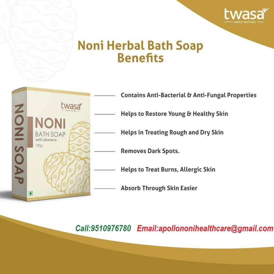 Our Noni Soap is unique, The soap has a pleasant tropical flower fragrance. Its blended with a fine grain of noni which gives a pleasant exfoliation. It nourishes and cleans your skin, you feel fresh for many hours., Noni is amazing health fruit, Twasa Noni Soap that offers all the goodness of the healing benefits of Noni Fruit infused with all natural, soothing oils., Provides sun protection and moisture retention, The Active Base contains a unique blend of pure and natural carrier oils, essential oils and extracts, Its beneficial effects on anti-aging, skin lightning, and skin enriching. You can use this soap not only for your body, but also for your face including removing cosmetics., Noni is especially notable for its moisturizing and skin restoring abilities, Calms irritation caused by acne or other skin troubles.