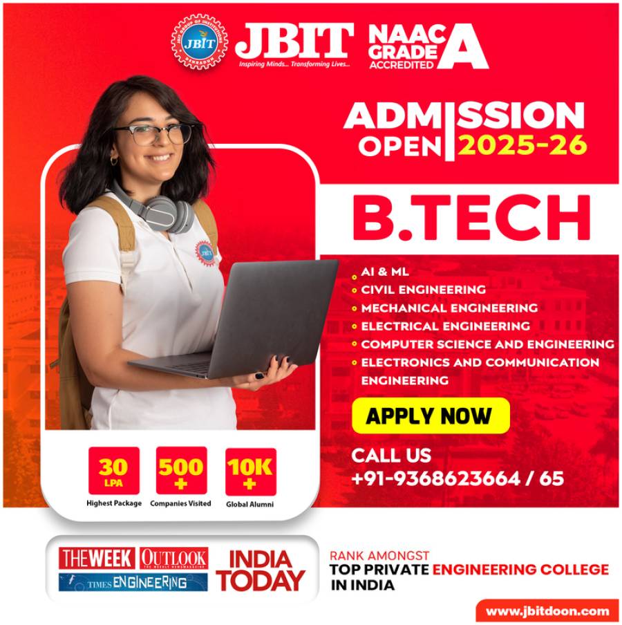 JB Institute of Technology is ranked amongst the best Pvt. Engineering colleges in Dehradun, Uttarakhand, India, to inspire you with a fresh insight into the world around you and unlock your potential to make the most of your career.