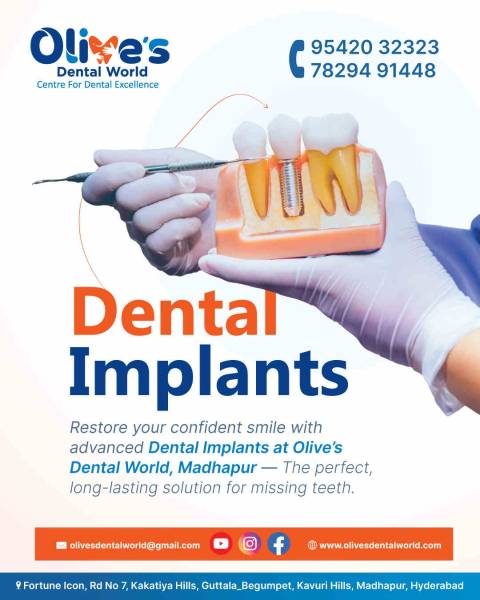 Learn how Dental Implants restore your smile and bite strength with precision care at Olive’s Dental World, Madhapur. Our implant specialists use advanced techniques to replace missing teeth, improve chewing function, and enhance your natural appearance. Enjoy durable, comfortable, and lasting results with customized treatment. Call +91 9542032323 today to rebuild your confident smile!
